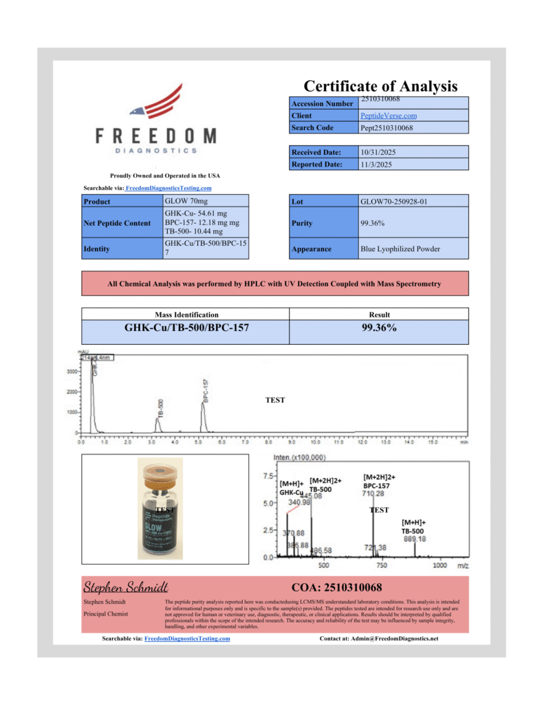 Net Peptide Content: GHK-Cu- 54.61 mg / BPC-157- 12.18 mg mg / TB-500- 10.44 mg