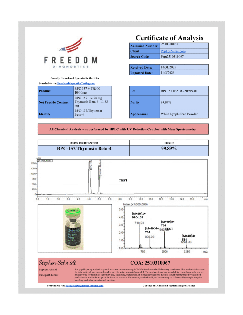 Net Peptide Content: BPC-157 – 12.78 mg / Thymosin Beta-4-11.83 mg